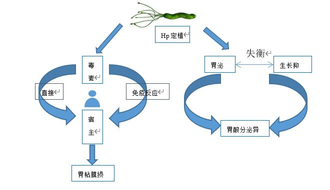 ① Hp定值后產(chǎn)生的毒素CagA和VacA可以直接或通過免疫反應(yīng)對胃黏膜形成損傷